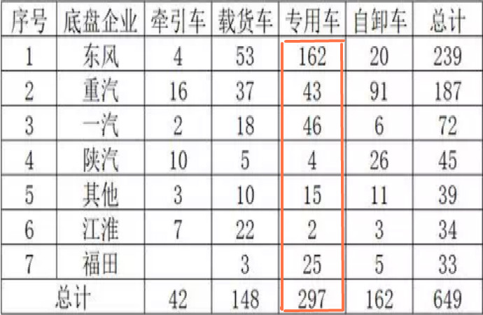 橫向比較幾款整車可以發(fā)現(xiàn),牽引、載貨、自卸大多為主機(jī)廠自己申報(bào),而國六專用車產(chǎn)品多為改裝廠申報(bào),所以是“兵家必爭之地”。